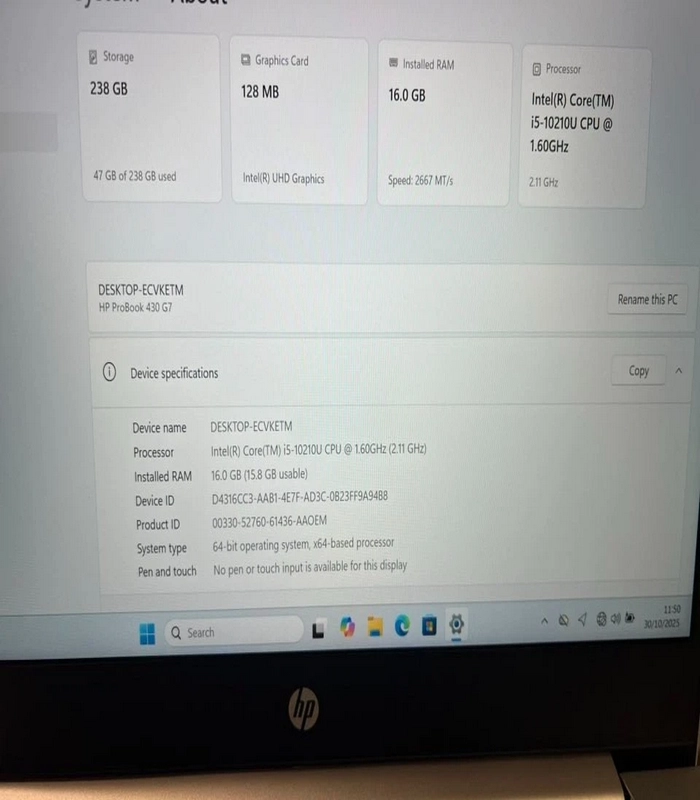 | Seller Notes | “Very good condition. HP ProBook 430 G7 FHD Core i5-10210U 10th Gen 16GB 256GB SSD Win 11 – VAT included. All ready, just power on and go.” |
